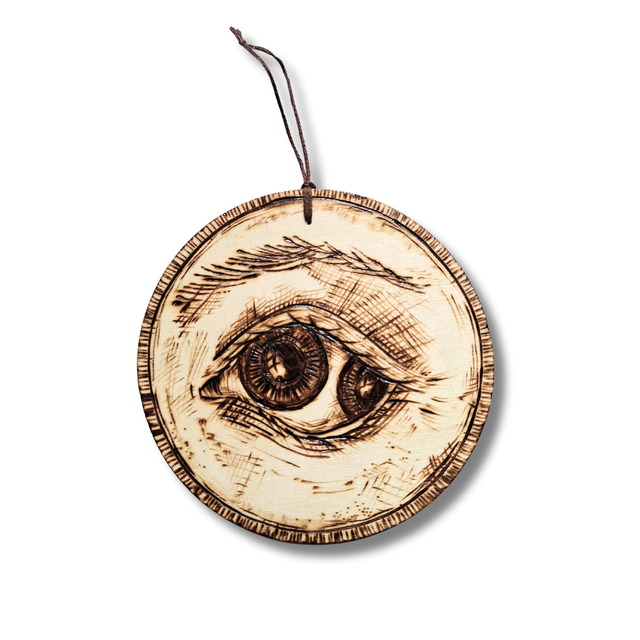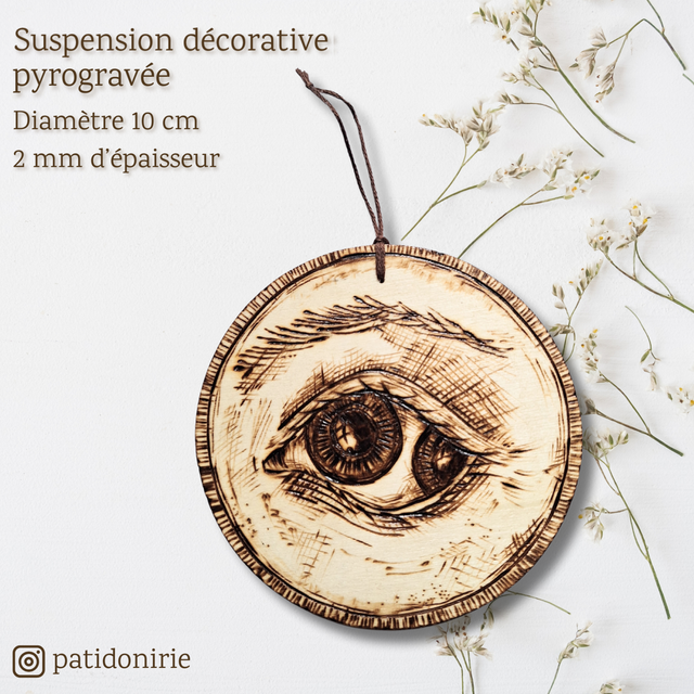 Cercle balsa pyrogravé, 10 cm de diamètre, épaisseur environ 2 mm, vernis.